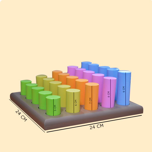 By fitting each piece into the cavity in the base and arranging into rows of ascending height, children learn to distinguish size, seriation and colour gradation.